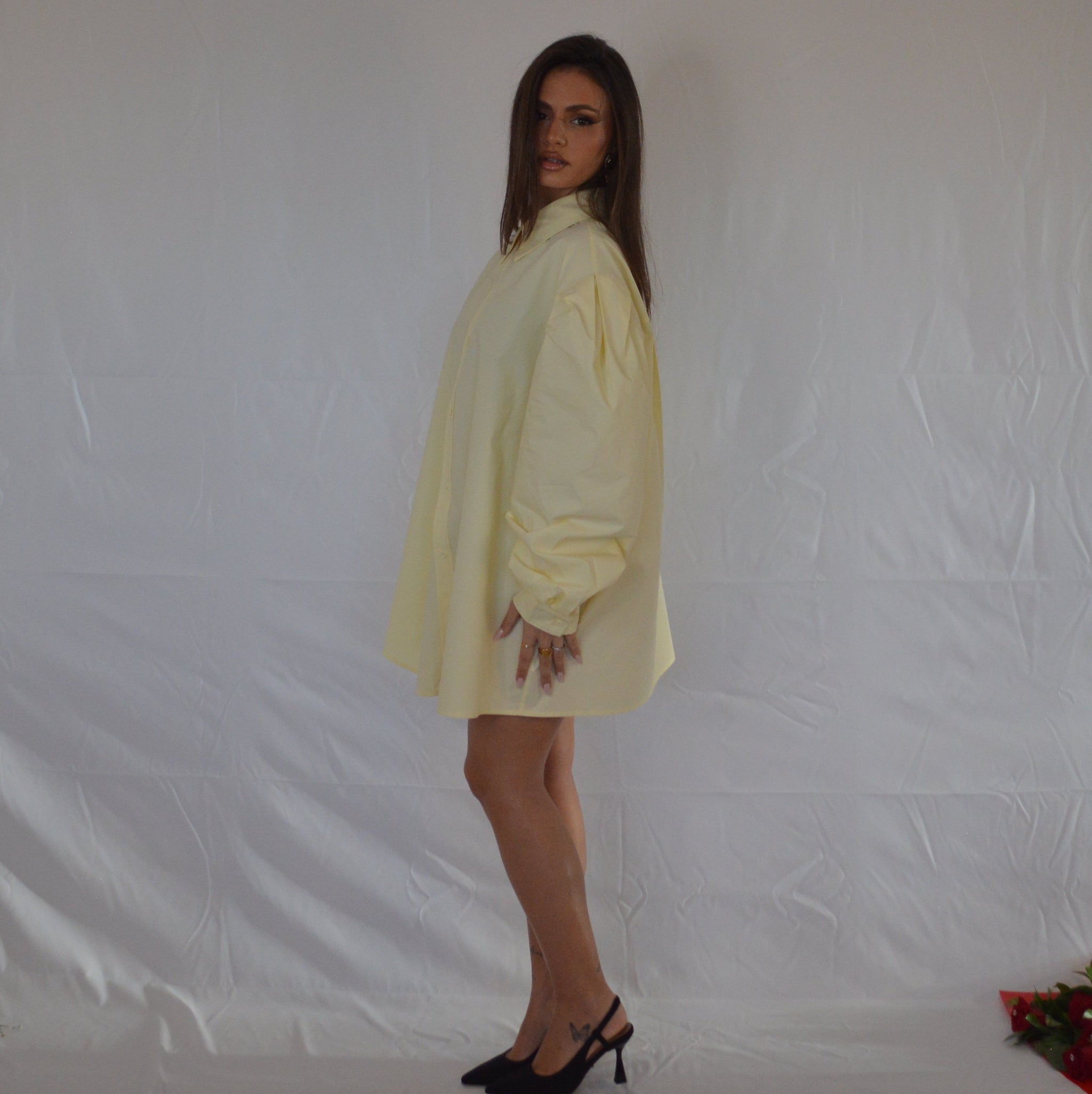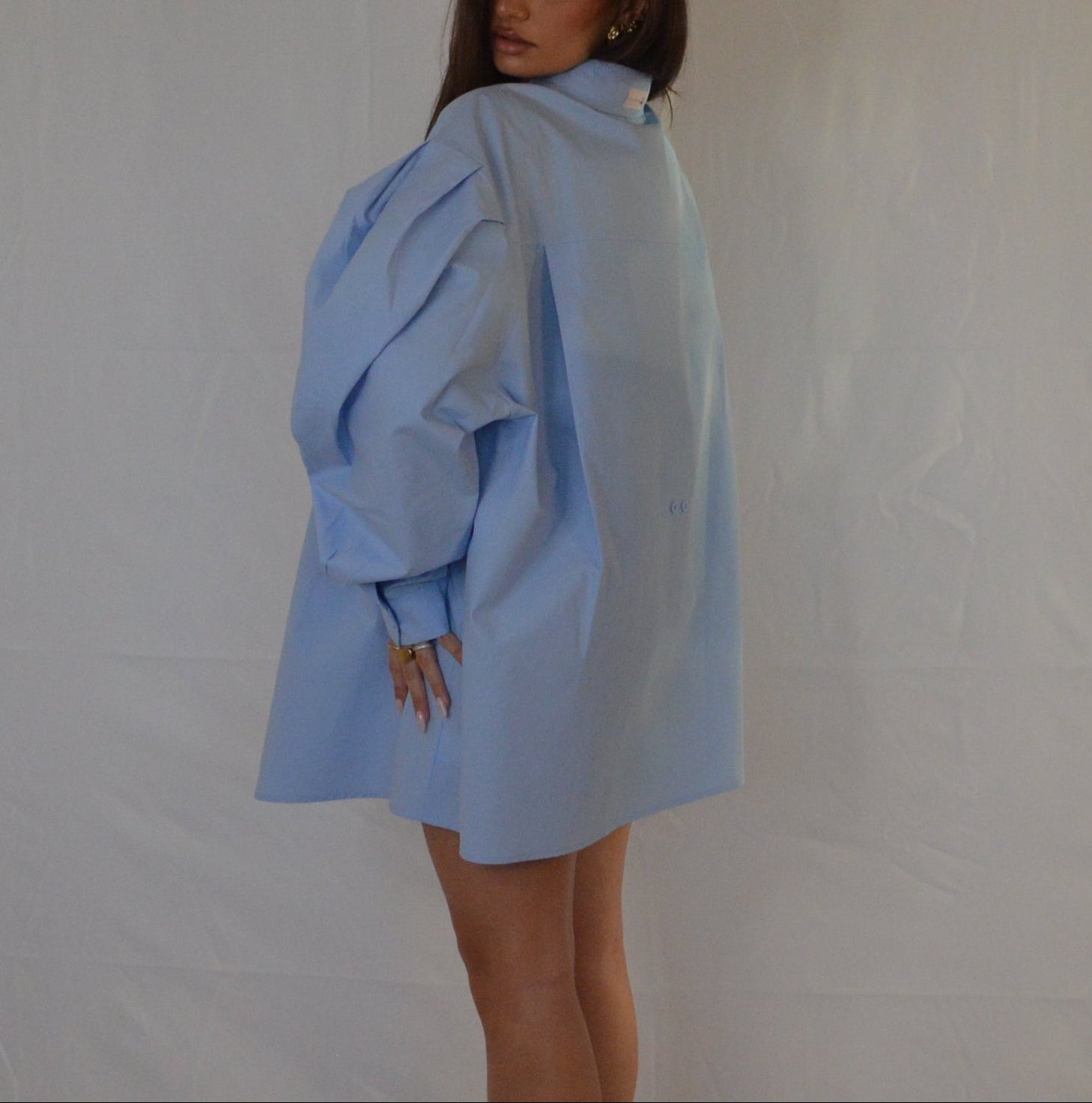 Camicia lunga in cotone con colletto strutturato e maniche a palloncino.