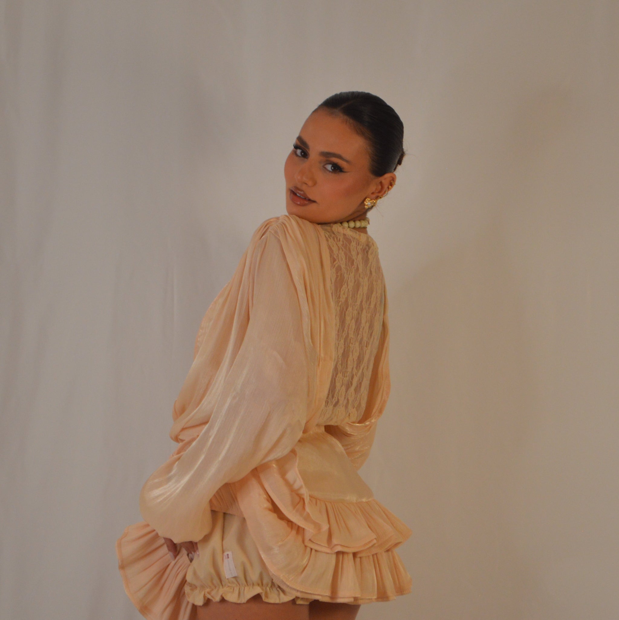 Abito due pezzi realizzato in tessuto effetto chiffon, leggero e fluido, con interno composto da culotte coordinata.