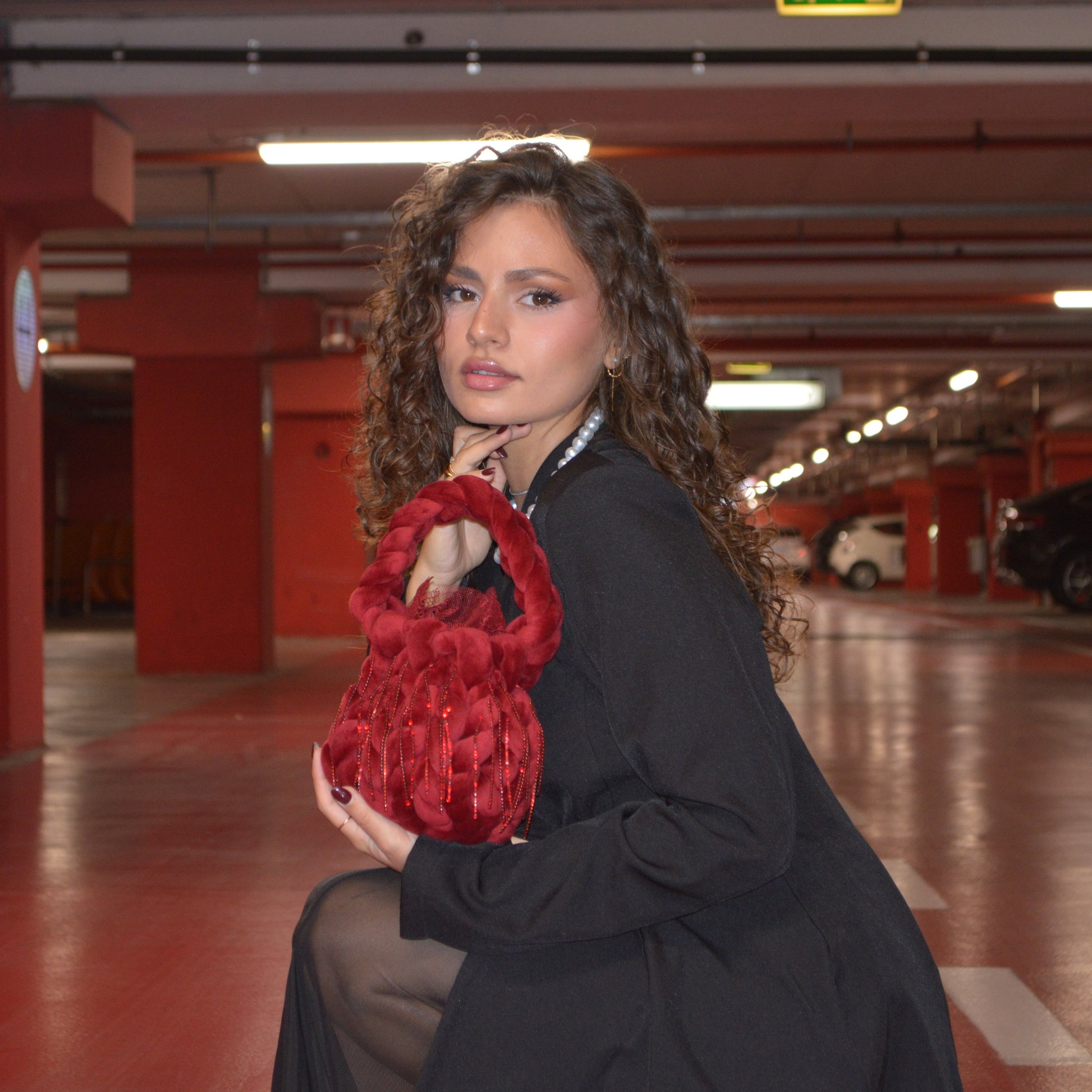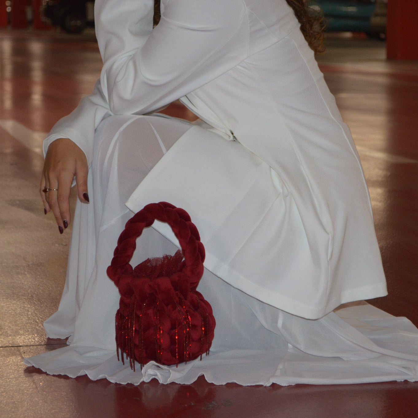 Mini bag in velluto bordeaux con frange di strass. Il bordo è rifinito con pizzo ton sur ton, applicato a mano.
